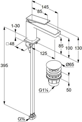 Змішувач для умивальника окремо стоячий KLUDI DECUS, матове золото. Гарантія Виробник надає гарантію на герметичність корпусів кріплень 10 років і 5 років на герметичність керамічних головок. Основні характеристики: - колір: матове золото - тип: умивальник - тип: одноважільний - монтаж: стоячий - тип виливу: стаціонарний - аератор Caché M 18,5 x 1 - картридж з керамікою з обмежувачем гарячої води - вхід холодної води середнє положення ручки - потік води 5 л/хв при тиску 3 бар - гнучкі напірні шланги G 3/8 - система швидкого монтажу - зливний комплект PUSH-OPEN Технічні дані: - висота: 130 мм - діапазон виливу: 125 мм - з'єднання: G 3 /8
