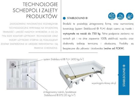 Чудова теплоізоляціяВикористані матеріали та компоненти забезпечують чудову теплоізоляцію, зберігаючи тепло поверхні душового піддону. Придушення шуму, до 40% тихіше Ефективна звукоізоляція падаючої води (до 40% - підтверджено випробуванням лабораторії Fraunhofer IBP, № P-BA 151/2013). 100% стабільність. Усі продукти Stabilsound Plus® забезпечують повну (100%) підтримку продукту, забезпечуючи найвищу безпеку для користувача. Надзвичайно міцна технологія Stabilsound Plus® забезпечує високу стійкість душових піддонів до тиску.