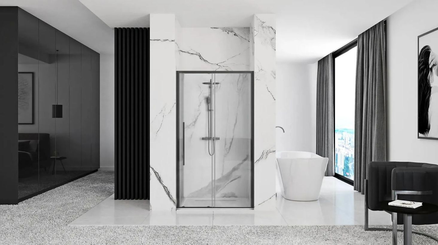 Solar Black Mat — це виразні, позачасові та сучасні душові двері, виготовлені з матеріалів найвищої якості та оброблені чорним ламінатом. Чорне матове покриття стійке до бруду та плям і його легко підтримувати в чистоті. Поєднання чорних профілів, довгої ручки і петель з прозорою лінією скляних поверхонь ідеально впишеться в сучасну і традиційну ванну кімнату. Чорний колір є однозначним лідером на ринку дизайну інтер’єру ванної кімнати.