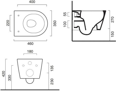 • - колір: білий - ширина: 35 см - довжина: 46 см - вага: 22 кг - без кріплення - об'єм змиву: 4,5 літра - настінний монтаж - стандартне покриття Cataglaze