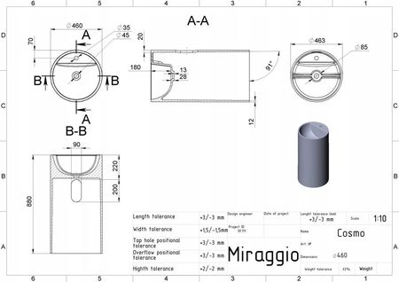 Умивальник MIRAGGIO COSMO окремо стоячий MATTE 46 см 0002301 Оригінальний умивальник COSMO MIRASOFT з глибокою круглою чашею неодмінно стане головною родзинкою вашої ванної кімнати. Його можна встановити на підлозі в будь-якому місці. Сантехнічна кераміка MIRAGGIO виробляється за власною технологією змішування бокситу* та поліефірної смоли у вакуумі. Умивальник виготовлений з матеріалу MIRASOFT. Виріб має однорідну структуру по всій товщині стінки, без додаткового покриття.