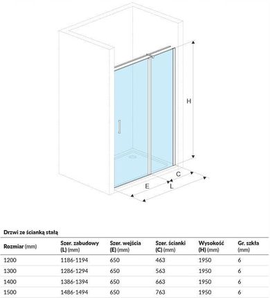 KAEX.3025.1D.0650.LP - Двері KAEX.3025.1S.1200.LP - Бічна стінка дверей ДВЕРІ РОЗРУШНІ З ФІКСОВАНОЮ СТІНОЮ Розмір (мм): 1200 Товщина скла (мм): 6 Ширина будівельна (мм): 1185-1200 Ширина входу (мм): 695 Ширина стінки (мм): 490-505 Висота (мм): 1950