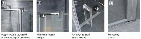 Тонкий підйомний шарнір можна повертати на 180 градусів. Загартоване скло, з якого виготовлена кабіна, має товщину до 6 мм. Зсередини вони покриті покриттям Clean Control, що полегшує очищення. Одинарні розсувні двері з нерухомою стінкою мають одинарні поворотні двері, доступні в розмірах 800, 900, 1000, 1200, 1300, 1400, 1500. Висота кабіни 1950 мм. Для складання кабіни замовте наступні елементи: