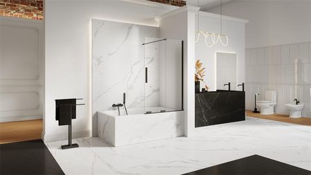 Розумна чорна шторка для ванни Колекція в модних чорних кольорах. Для виробів характерні мінімалістичні деталі та великі скляні панелі. Таке характерне та позачасове поєднання означає, що колекція не втратить свого елегантного стилю з роками. Перегородка для ванни, встановлена ​​на ванну, - ідеальне рішення як для любителів довго приймати ванну, так і для тих, хто віддає перевагу швидкому душу. Безпечне загартоване скло товщиною 8 мм, покрите захисним покриттям Active Shield, забезпечує безпечне використання екрану всіма домочадцями.