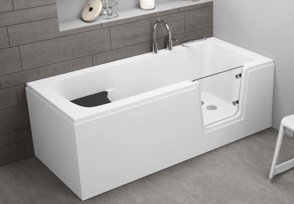 Щільні бічні дверцята ванни Polimat Avo полегшують людям похилого віку та інвалідам самостійне використання прямокутної ванни під час купання.