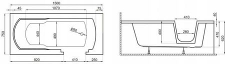 Ванна AVO з дверцятами для пенсіонерів 150х75 см білий корпус чорний корпус Довжина: 150 см. Ширина: 75 см. Загальна висота: 62 см. Висота краю: 4 см. Глибина: 47 см. Ємність: приблизно 150 л. Діаметр зливу: 50 мм. Форма: прямокутна.