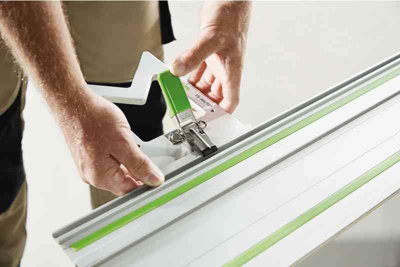 90°. Ні більше, ні менше. Упор, відфрезерований з цілісного шматка алюмінію, гарантує точні та повторювані різи під прямим кутом без необхідності додаткового регулювання. Завдяки системі швидкої зміни кутовий обмежувач можна швидко прикріпити до напрямної, що робить його мобільною панельною пилою в поєднанні з ручною циркулярною пилкою та робочим столом.