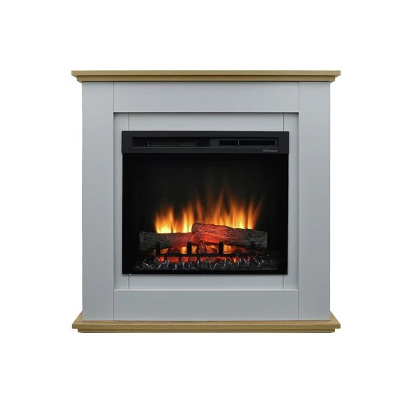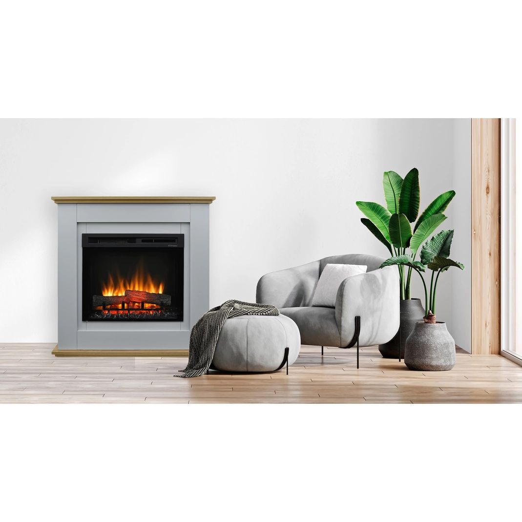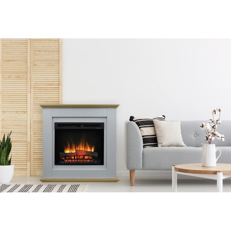 окремо стоячий електричний камін сірого кольору з енергозберігаючим світлодіодним освітленням, оснащений функцією обігріву