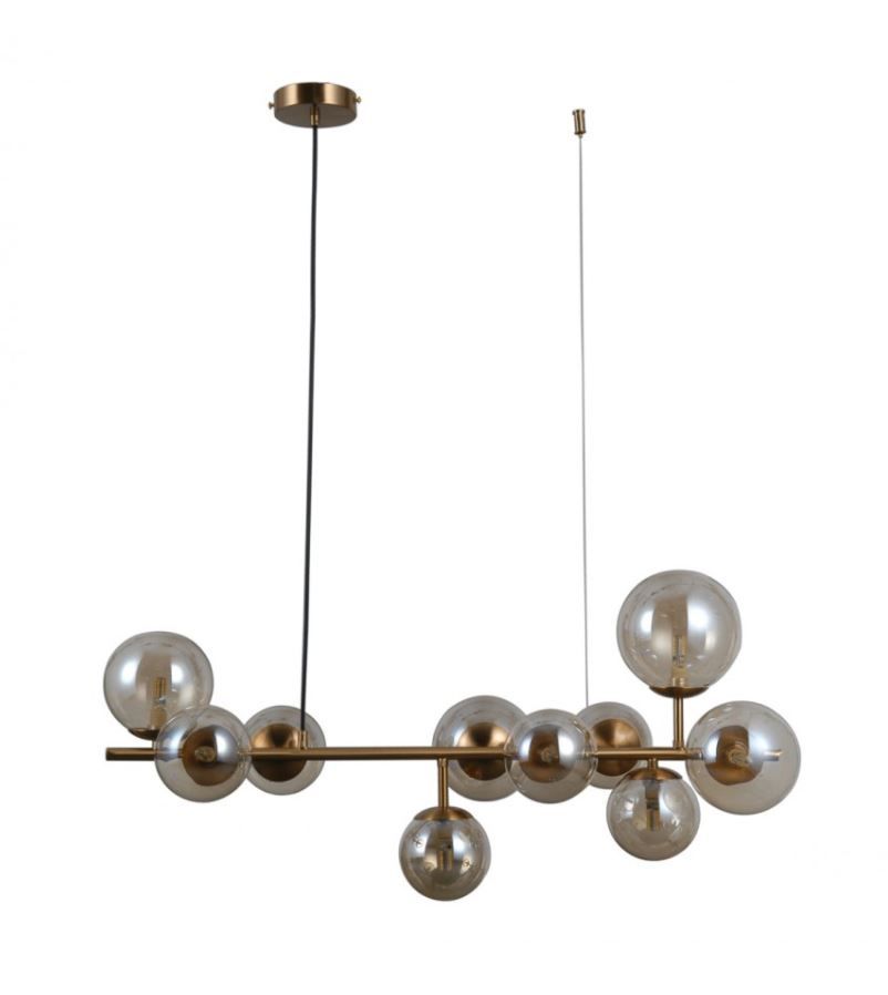Технічні характеристики: Висота: 120 смШирина: 80 смДовжина: 28,9 смРегулювання висоти: ТакМатеріал: МеталДодатковий матеріал: СклоОсновний колір: Бурштинова латуньДодатковий колір:Димовий цоколь: G9Потужність лампи: 5 ВтНапруга живлення: 230 ВКількість лампочок: 10 Регулювання кута світла: НіСумісно з Світлодіод: Так Джерело світла включено: Немає Клас захисту від проникнення: IP20