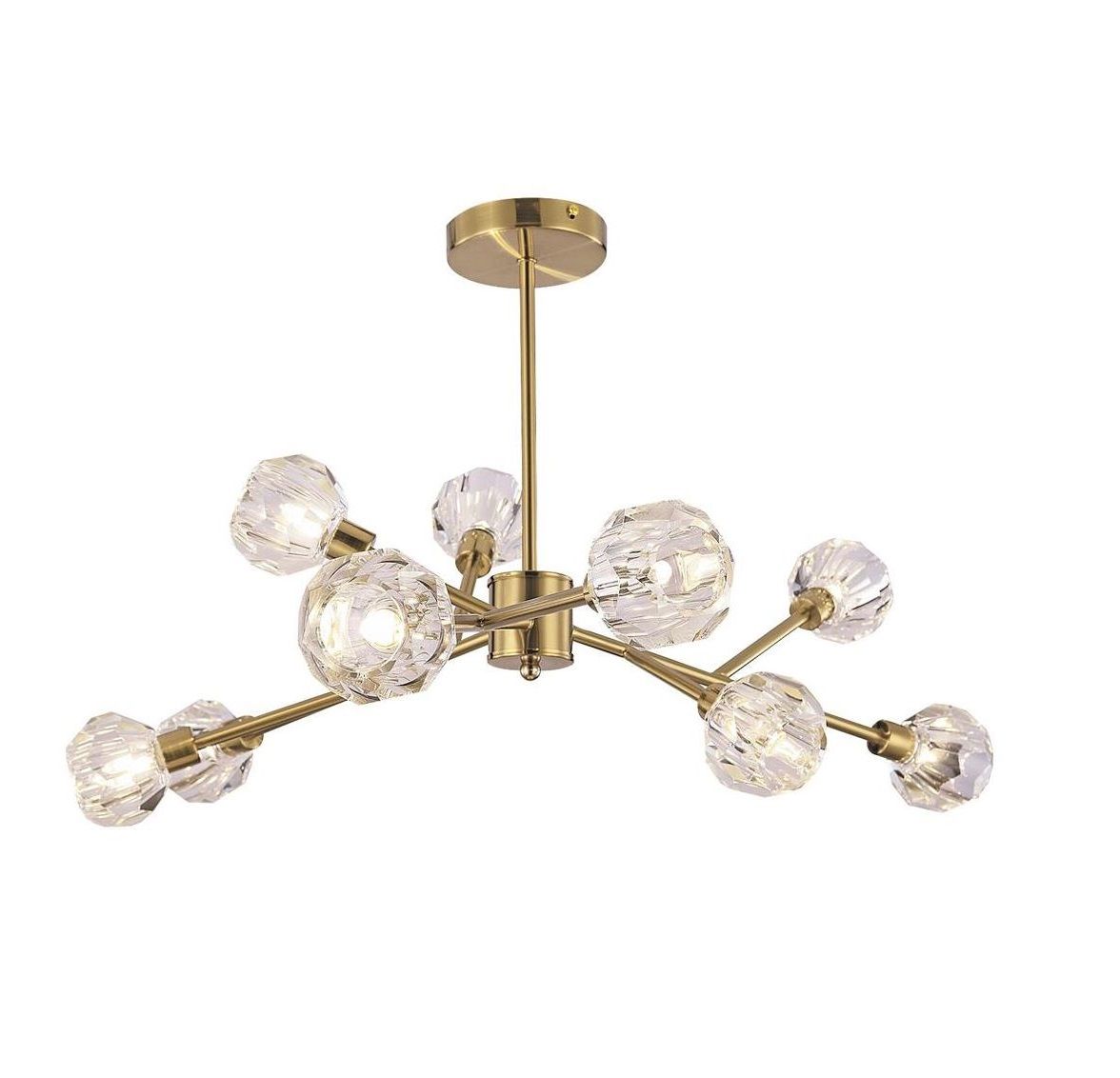 Технічні дані: Цоколь: G9 Кількість джерел світла: 9 Джерело світла в комплекті: Немає Потужність: макс. 5 Вт Джерело живлення: 230 В, 50 Гц Ступінь захисту: IP20 Матеріал: метал, скло Колір: золото Ширина: 615 мм Висота: 430 мм