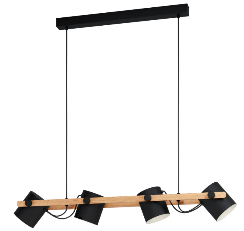 Підвісний світильник у вінтажному стилі Серія HORNWOOD. Чотири металеві чорні абажури, що закривають прямі лампочки світловий промінь вниз. Корпус лампи виготовлений зі світлого дерева. Лампа адаптована до джерел світла з класичною великою різьбою, а не до ламп входять в комплект поставки. Світильник ідеально підійде для сучасного середовища інтер'єрах, на кухні, їдальні, холі або у вітальні над столом.