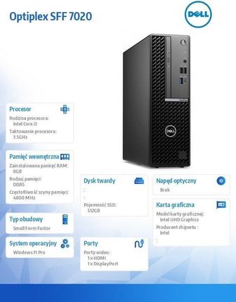 Безпека та продуктивність Організації повідомляють про зниження на 58% випадків безпеки з пристроями Windows 11 Pro. Пристрої Windows 11 Pro роблять роботу легшою та продуктивнішою. Легко перемикайтеся між місцями за допомогою багатозадачності на базі штучного інтелекту, миттєвого замовлення та продуктивності, щоб прискорити складні робочі навантаження в середньому на 42%. Опис стосується настільних комп’ютерів серії OptiPlex у корпусі SFF. Фактичні характеристики можуть відрізнятися залежно від конфігурації комп’ютера. Модель інформації про продукт Optiplex SFF 7020 Сімейство процесорів Intel Core i3 Тактова частота процесора 3,5 ГГц Підвищена тактова частота 4,7 ГГц Покоління процесора чотирнадцять Кількість ядер 4 Кількість потоків 8 Кеш L3 12 МБ Інша інформація про процесор Intel Core i3-14100 Intel vPro NoInstalled RAM Макс. 8 ГБ. розмір пам'яті 64 ГБ Кількість використовуваних слотів пам'яті 1 Кількість слотів вільної пам'яті 1 Тип пам'яті DDR5 Частота шини пам'яті 4800 МГц Тип SSD Тип диска Ємність SSD 512 ГБ Ширина SSD Формат M.2 Інтерфейс SSD PCI-Express Модель відеокарти Intel UHD Graphics Chipset виробник Intel Video ports 1 x HDMI1 x Мережевий інтерфейс DisplayPortBluetooth 1 x 10/100/1000 Мбіт/sWi-Fi 802.11a/b/g/n/axОптичний привід Немає Пристрій для зчитування карт пам’яті Немає портів USB 1 x USB 3.1 Type-C3 x USB 3.0 Type-A4 x USB 2.0 Type-Other порти I/O 1 x RJ-451 x Audio (Combo) Слоти розширення 1 x PCIe 3.0 x 161 x PCIe 3.0 x 1 Блок живлення 180 Вт Колір Чорний Малий корпус Висота 290 мм Ширина 92,6 мм Глибина 292,8 мм Вага 5,38 кг Операційна система Windows 11 Pro Додаткове програмне забезпечення Пробна версія Microsoft Office Аксесуари включені Документація Мультимедійна клавіатура Dell KB216 - США Міжнародна (QWERTY) - чорна Оптична миша Dell MS116 - чорний європейський шнур живлення Інформація про гарантію 3 роки ProSupport