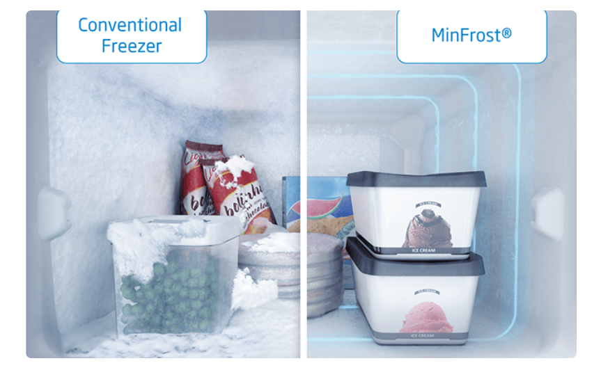 Лід, що утворюється в холодильниках, може призвести до злипання їжі та збільшення споживання енергії. Спеціальна система MinFrost® мінімізує утворення інею в морозильній камері. Таким чином продукти краще зберігаються, ви економите енергію та витрачаєте менше часу на розморожування морозильної камери.