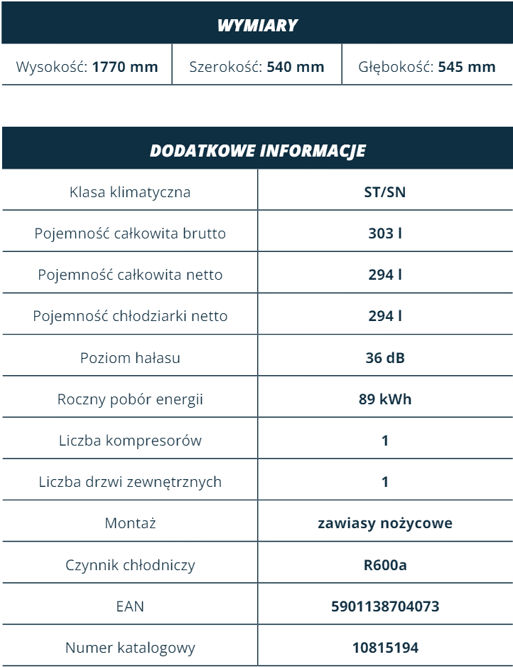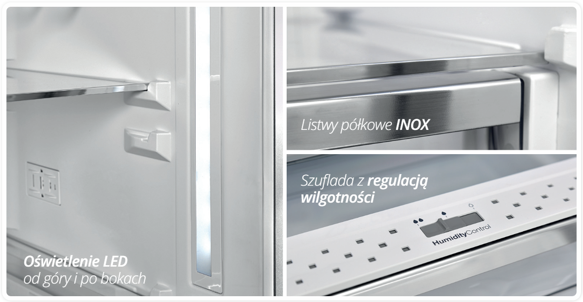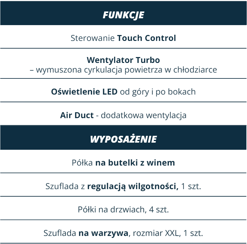 | Функції | Oświetlenie LED, Wentylator w chłodziarce, System sterowania elektronicznego |