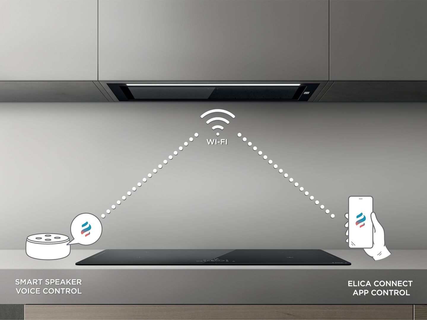 Витяжка Hidden2.0 @ забезпечує більше свободи та дає вам час зосередитися на приготуванні їжі. Пристроєм можна керувати через голосовий помічник або додаток Elica Connect. Всього декількома клацаннями ви можете включити відсмоктування витяжки та встановити відповідне освітлення, а також постійно контролювати стан фільтрів або замовити послугу.
