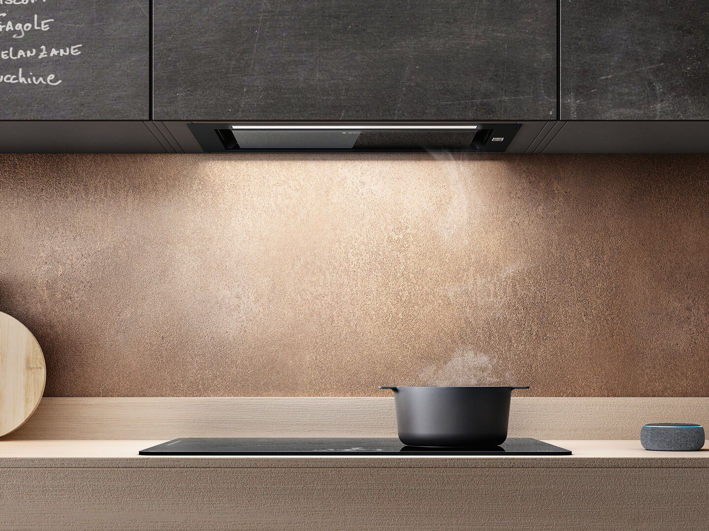 Програма Elica Connect і голосовий помічник також дозволяють регулювати інтенсивність і колір світла, від холоднішого, елегантнішого відтінку білого до теплішого, більш обволікаючого світла, таким чином створюючи інтер’єрну атмосферу, яка відповідає часу. день чи нагода. Модель Hidden2.0 @ розроблена для встановлення в навісні шафи та характеризується периферійною системою поглинання кухонних випарів і запахів.