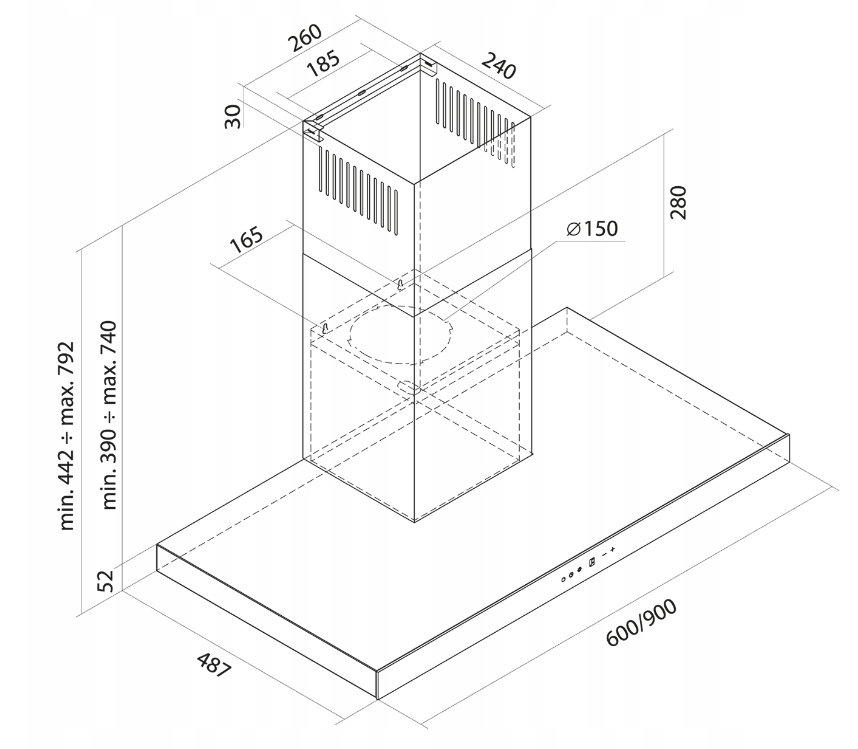 Ширина: 90 см Мінімальна гучність: 47 дБ Діаметр виходу: fi15 см