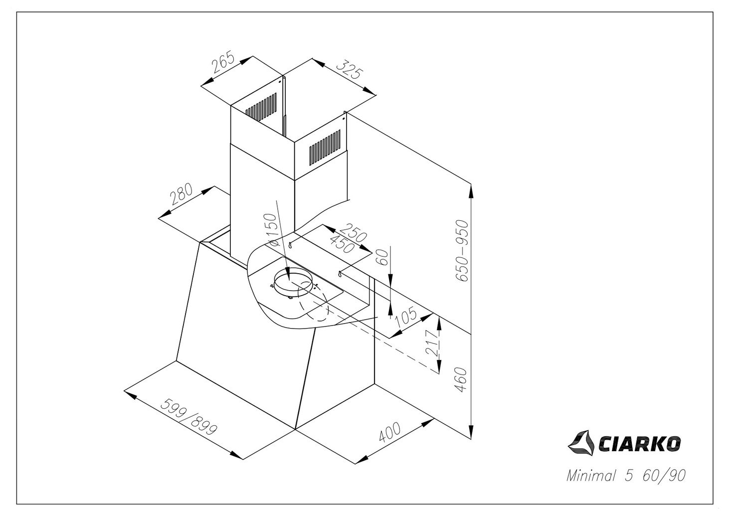Висота 460 мм Ширина 599 / 899 мм Глибина 400 мм Вага нетто Мінімум 5 60 - 15 кг / мінімум 5 90 - 19 кг Клас енергоспоживання A+++ Мін. відстань від електричної плити 55 см Мін. відстань від газової плити 65 см Діаметр виходу повітря 15 см Потужність двигуна 160 Вт Потужність освітлення 3 Вт Загальна потужність 163 Вт Довжина електричного кабелю 2 м Рівень шуму min-max (boost) Мінімум 5 60 45-62 (69) дБ Рівень шуму min-max (boost) Мінімум 5 90 43-59 (69) дБ Мінімальна-максимальна ефективність (підвищення) Мінімум 5 60 200-450 (700) м3/год