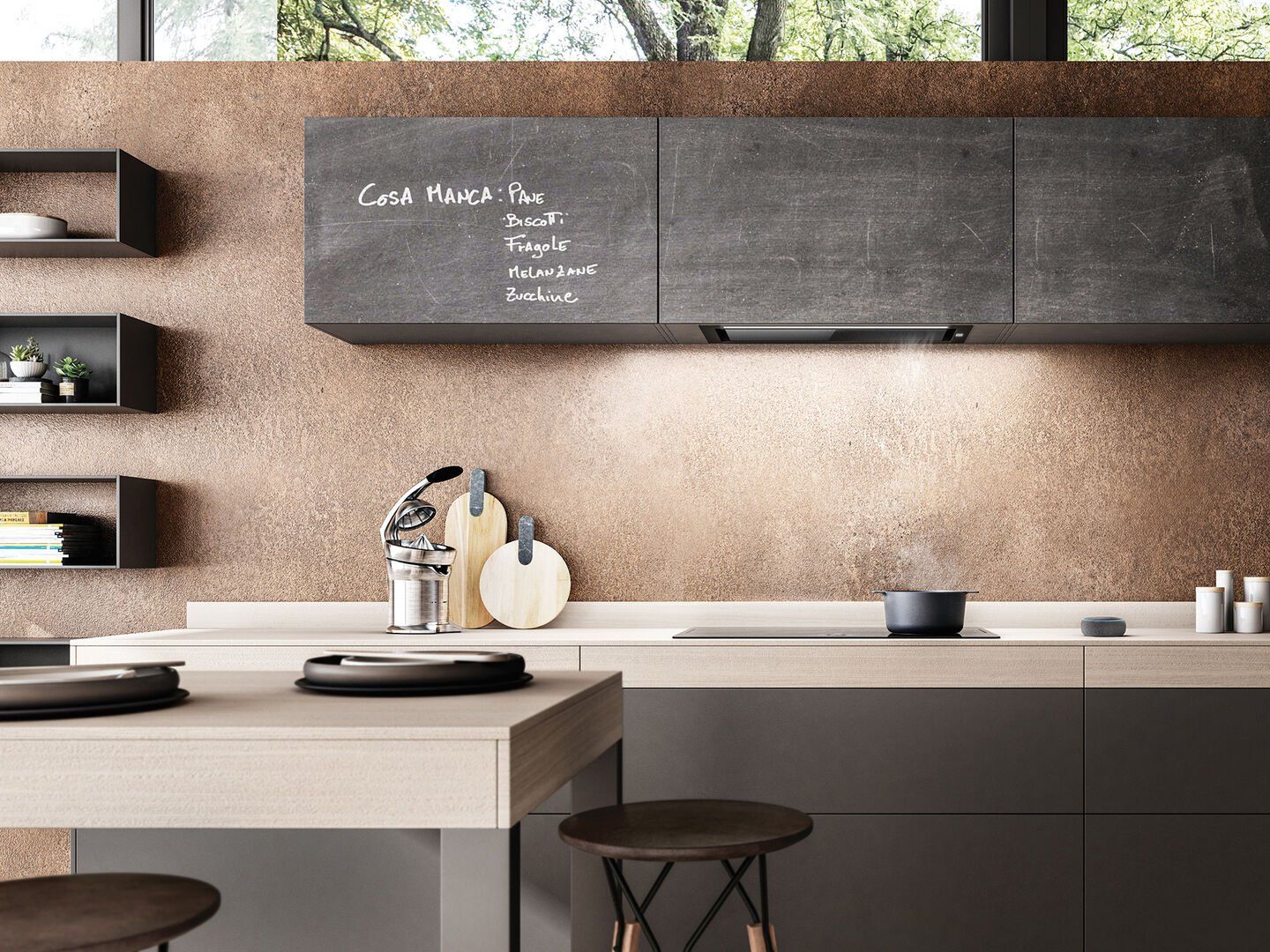 Програма Elica Connect і голосовий помічник також дозволяють регулювати інтенсивність і колір світла, від холоднішого, елегантнішого відтінку білого до теплішого, більш обволікаючого світла, таким чином створюючи інтер’єрну атмосферу, яка відповідає часу. день чи нагода. Модель Hidden2.0 @ розроблена для встановлення в навісні шафи та характеризується периферійною системою поглинання кухонних випарів і запахів.