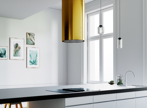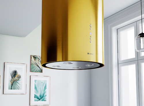 Золотистий колір витяжки може набувати іншого відтінку золота залежно від кольору та інтенсивності освітлення на кухні. Обидві круглі решітки (верхня і нижня частини) пофарбовані одночасно і в один колір. Верхня решітка має менший діаметр, ніж нижня частина витяжки, що може викликати різне відбиття світла і створити ілюзію іншого відтінку кольору. Ця витяжка призначена для установки над кухонним островом. Її також можна використовувати як настінну витяжку, прикріпивши її до стелі впритул до стіни.