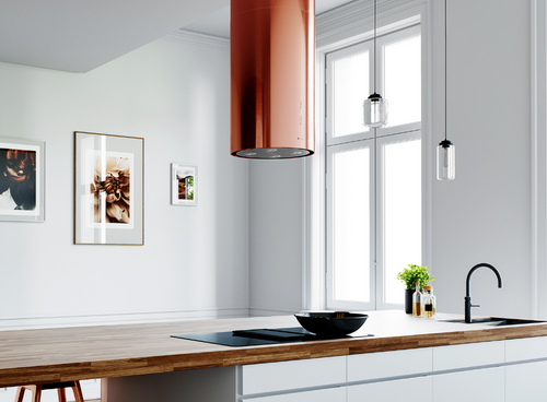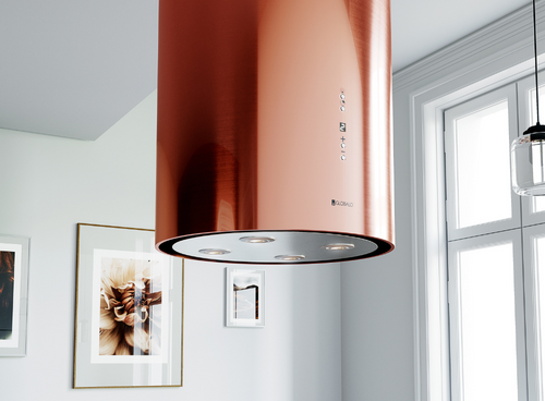 Мідний колір витяжки, залежно від кольору та інтенсивності освітлення на кухні, може мати інший відтінок міді. Обидві круглі решітки (верхня і нижня частини) пофарбовані одночасно і в один колір. Верхня решітка має менший діаметр, ніж нижня частина витяжки, що може викликати різне відбиття світла і створити ілюзію іншого відтінку кольору. Ця витяжка призначена для установки над кухонним островом. Її також можна використовувати як настінну витяжку, прикріпивши її до стелі впритул до стіни.
