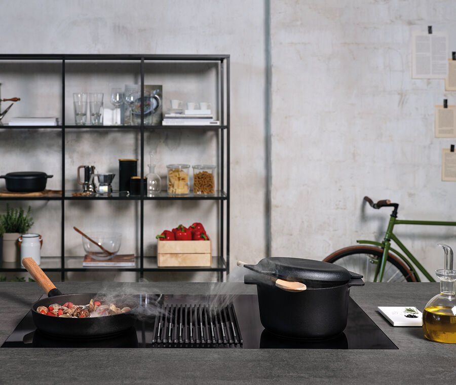 Виріб працює в режимі витяжки і вимагає підключення до вентиляції. Витяжка оснащена 5 рівнями поглинання запахів, а завдяки інтеграції з варильною поверхнею вона ідеально регулює потужність всмоктування для збирання всіх випарів. Крім того, операції з технічного обслуговування є швидкими та зручними. Ви можете легко вийняти відновлені жирові та вугільні фільтри зверху, щоб отримати доступ до внутрішньої частини та усунути будь-які випадкові витоки. Крім того, є спеціальний клапан, який дозволяє зливати пролиті рідини, забезпечуючи максимальну гігієну на кухні.