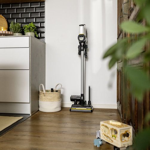 Повністю обладнаний і універсальний пристрій: безмішковий пилосос VC 6 Cordless ourFamily Extra має багато аксесуарів для полегшення прибирання. Окрему паркувальну станцію не потрібно кріпити до стіни.